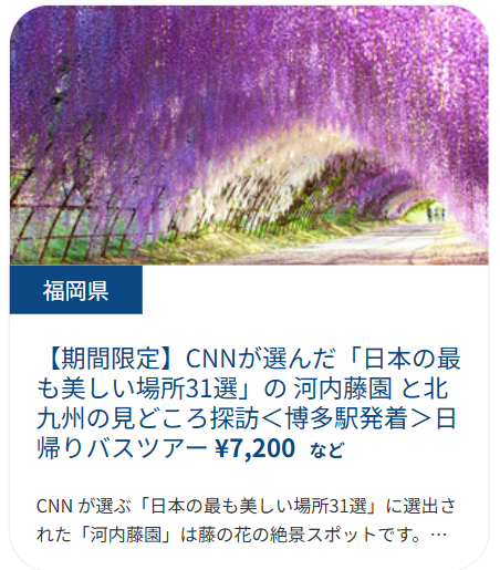 そして、CNNに選ばれた「河内藤園」へと向かいます。広大な敷地に咲き誇る藤をお楽しみください。(4月下旬~5月上旬)