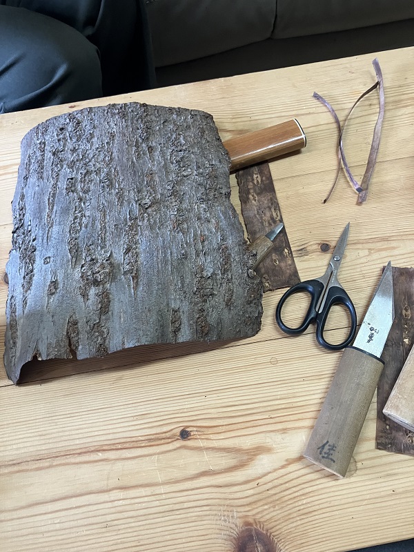 After a brief presentation by Mariko san about the history of Hakata bentwood boxes, and an orientation to the very specific materials that are used to make them, the hands-on part of the workshop began. We learned how to cut the bark of wild mountain cherry trees into thin strips and to process them into the beautiful contrasting weaving material that makes the characteristic dark squares on the sides of Hakata cedar boxes.